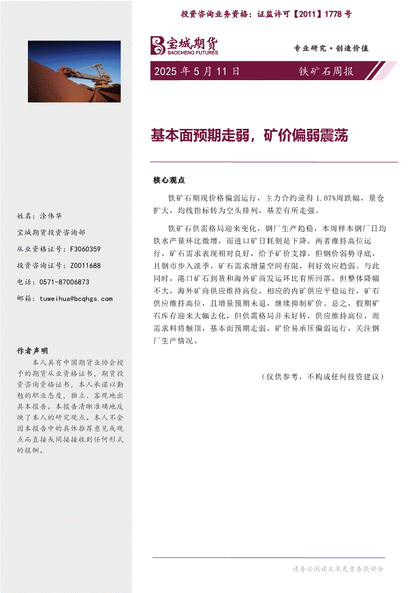 铁矿石供需格局迎来变化,钢厂生产趋稳,本周样本钢厂日均铁水产量环比微增,而进口矿日耗则是下降,两者维持高位运行,矿石需求表现相对良好,给予矿价支撑,但钢价弱势寻底,...