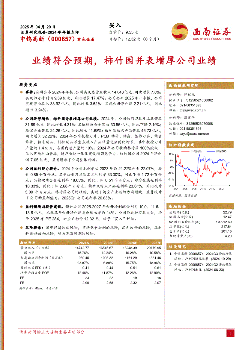 事件:公司公布2024年年报,公司实现总营业收入147.43亿元,同比增长7.8%;实现归母净利润9.39亿元,同比增长17.47%。公司公布2025年一季报,公司实现营业收入33.92亿元,同比增长3.52%;实现归母净利润2.21亿元,同比增长3.24%。