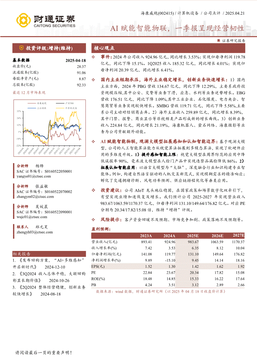 事件:2024年公司收入924.96亿元,同比增长3.53%;实现归母净利润119.78亿元,同比下降15.1%。1Q2025收入185.32亿元,同比增长4.01%;实现归母净利润20.39亿元,同比增长6.41%。